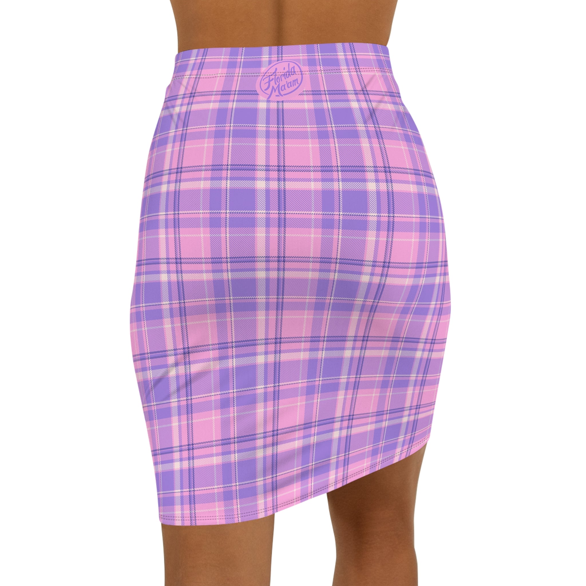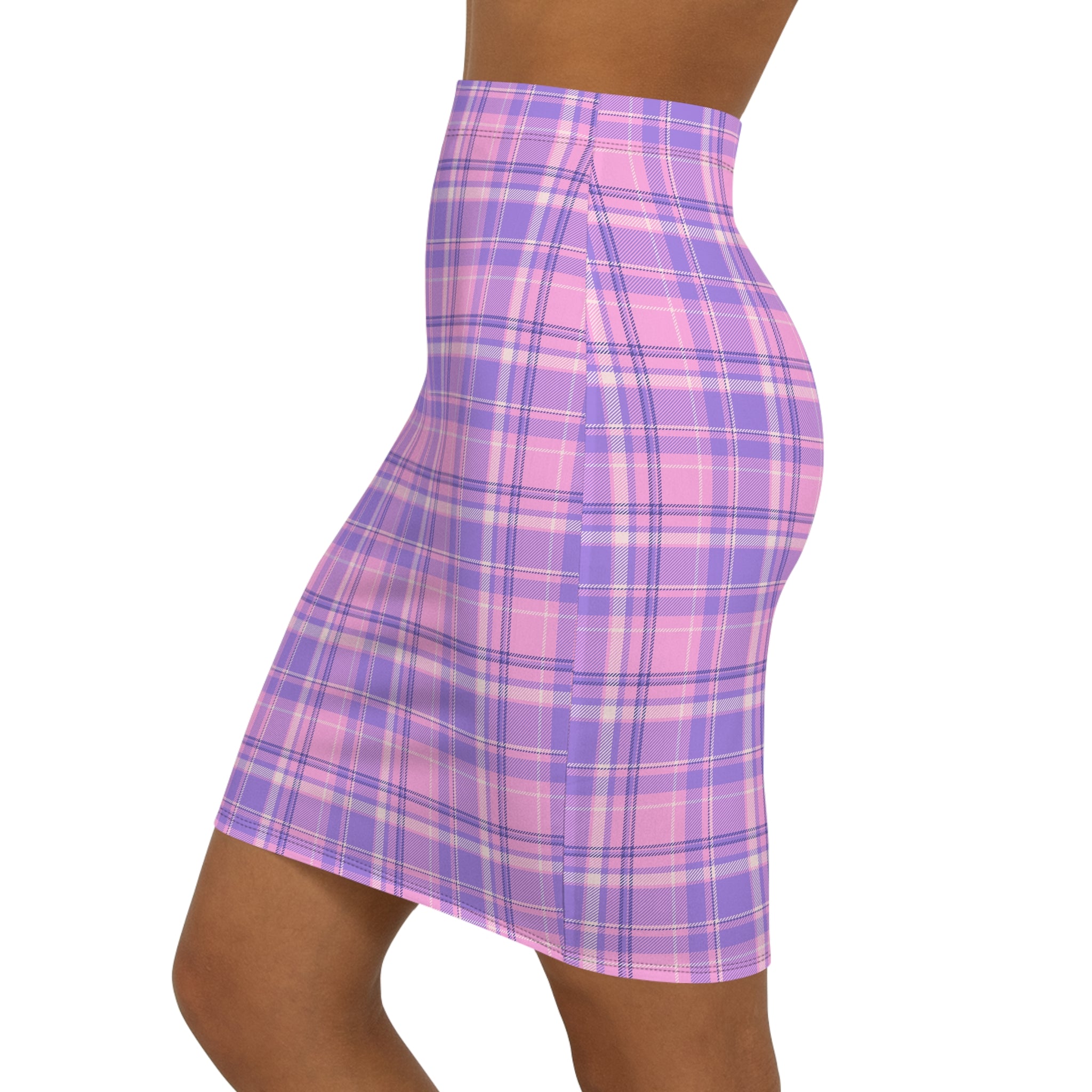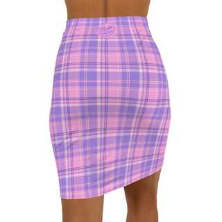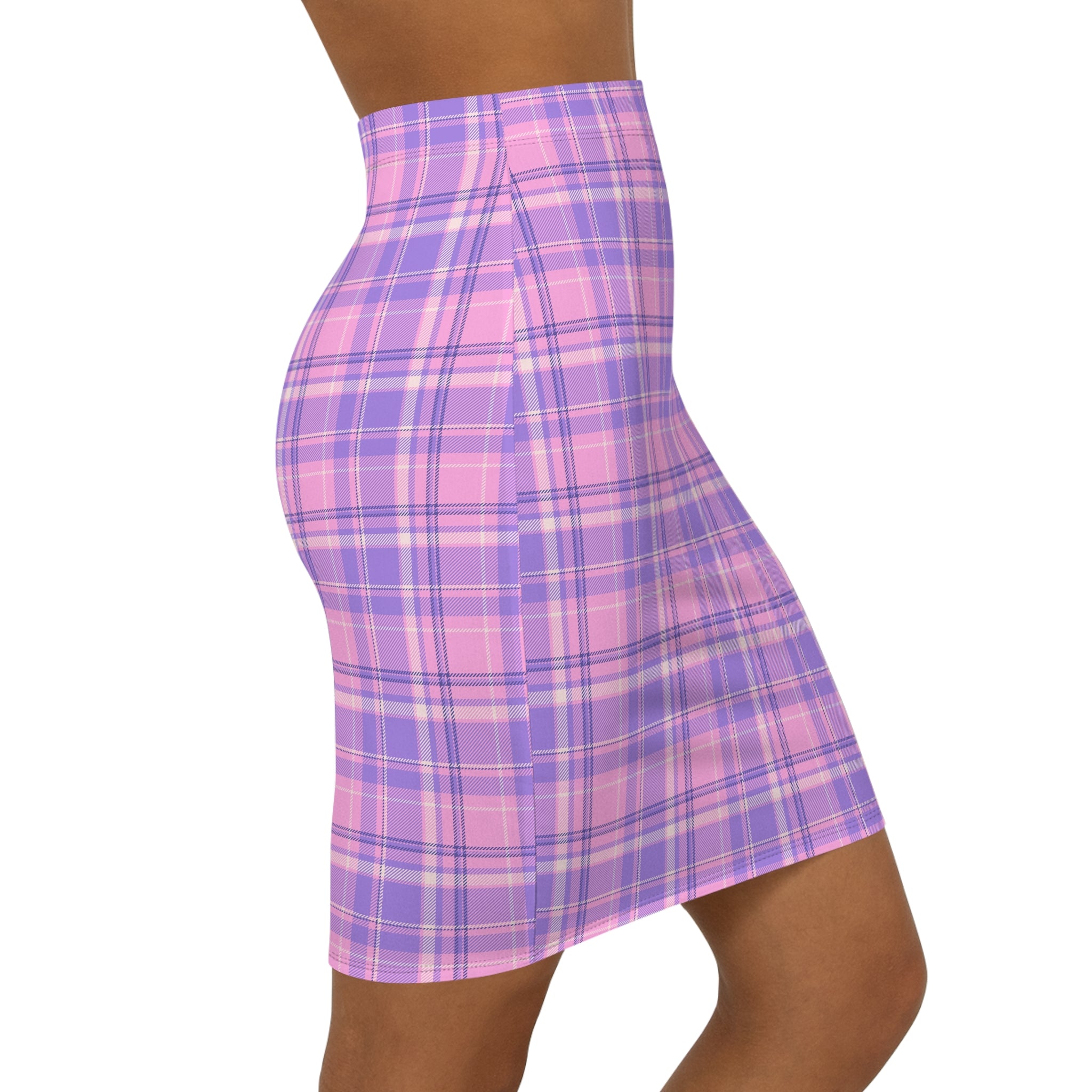 -waist pencil skirt in a soft, stretchy plaid that feels both playful and polished. The light pink and lavender check reads like a modern twist on classic schoolgirl tartan — bright without being loud. The fabric hugs curves with breathable 4-way stretch, while an elastic waistband keeps the silhouette neat and comfortable for long days. Wear it with an oversized sweater and chunky boots for a cozy city stroll, or tuck in a blouse and add heels for evenings when you want to lean into femme tailoring. Subtle black seam stitching and an all-over print ensure the pattern stays vivid through wear. Assembled in the USA from globally sourced parts, this skirt blends everyday ease with a distinctly nostalgic, modern style.