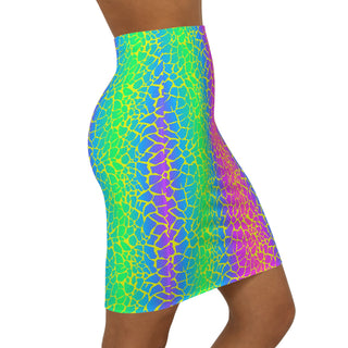 A vibrant mid-waist pencil skirt that brings playful, retro energy to everyday wear. The all-over print ripples in neon gradients of pink, green and blue, edged with an organic mosaic pattern that feels both tropical and electric. The slim, mid-rise silhouette hugs curves while the 4-way stretch fabric moves with you — whether you're dancing at a beach party, layering for a colorful night out, or adding a statement piece to your wardrobe rotation. An elastic waistband and smooth seams keep the look clean and comfortable. This skirt reads like a confident pop of color that elevates casual tees, cropped tops, or a sleek blazer for an unexpected contrast.