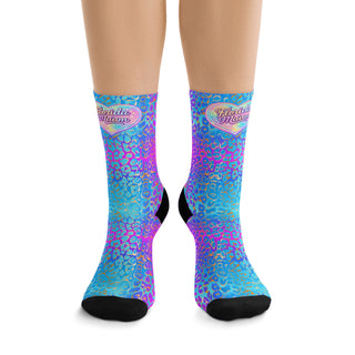 Slide into color and texture that feel like a confident wink. These recycled poly socks carry a vibrant, watercolor leopard print in electric aqua, fuchsia and violet — a playful clash of wild and dreamy. They sit mid-calf with a snug 200-needle knit that hugs without squeezing, and a reinforced black heel and toe for everyday wear. The recycled polyester blend gives a lightweight stretch and vivid all-over printing, so your outfit gets an instant personality boost whether you’re layering under boots or peeking out from sneakers. Expect a first-wash color shift; treat them gently and they’ll keep their spirited look.