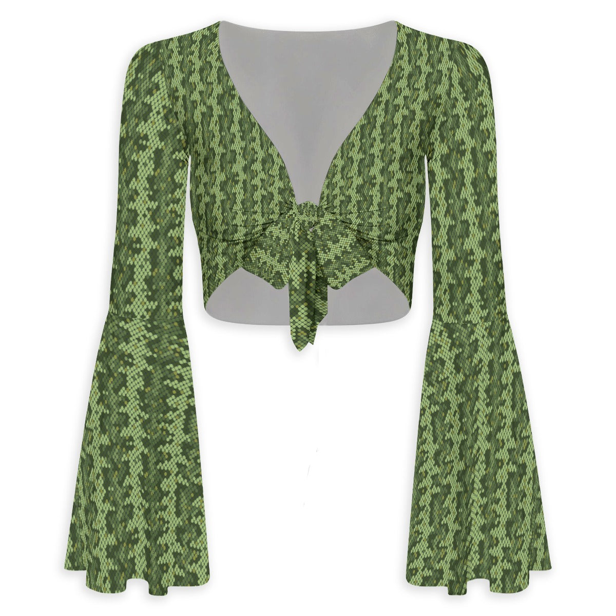 Add a touch of effortless elegance to your wardrobe with this lightweight crop top. The fine, tight weave lends a luxurious feel, while the airy material drapes beautifully for added comfort and femininity.This cropped top features a deep V-neck and front tie design, adding a touch of playful sophistication to any look. The striking flared sleeves create a dynamic silhouette, and the soft flow allows you to dance gracefully.Pair with high-waisted jeans or a skirt for date night, music festivals, or brunch with friends. A versatile piece for your spring and summer wardrobe.